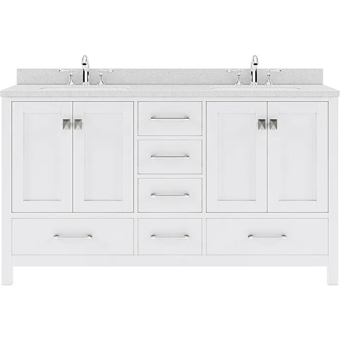 The Caroline Avenue vanity collection emanates an understated elegance that brings beauty and grace to just about any living space. Contemporary shaker style doors and clean lines make it a versatile addition to modern or transitional designs while offering bountiful storage as to not sacrifice functionality. Soft-closing door hinges and drawer glides provide added luxury, safety, and longevity. Each Caroline Avenue vanity is handcrafted with a 2" solid wood birch frame built to last a lifetime.The Caroline Avenue vanity collection emanates an understated elegance that brings beauty and grace to just about any living space.Contemporary shaker style doors and clean lines make it a versatile addition to modern or transitional designs while offering bountiful storage as to not sacrifice functionality.Functional & Versatile - Soft-closing door hinges and drawer glides provide added luxury, safety, and longevity. Each Caroline Avenue vanity is handcrafted with a 2" solid wood birch frame built to last a lifetime.Vanity kit includes quartz countertop in Dazzle White. Unmatched in resilience, this countertop is non-porous and extremely resistant to impact, stains, and scratches. Conveniently pre-drilled for ease of installation and never requires sealing.Easy Installation - Base cabinet is fully assembled and ready to be installed.Bathroom Vanity Set - This vanity kit includes cabinet, sinks, and countertop. Components have been expertly designed and engineered for optimal stylistic fit and compatibility with this particular cabinet.Sized For Fit & Storage - 60 in. W x 22 in. D x 35 in. HIncludes - 60" White Cabinet, Dazzle White Quartz Countertop, 2 Round Undermount SinksAmple Storage - 4 Total Functional Soft-Close Doors and 5 Total Functional Soft-Close Drawers