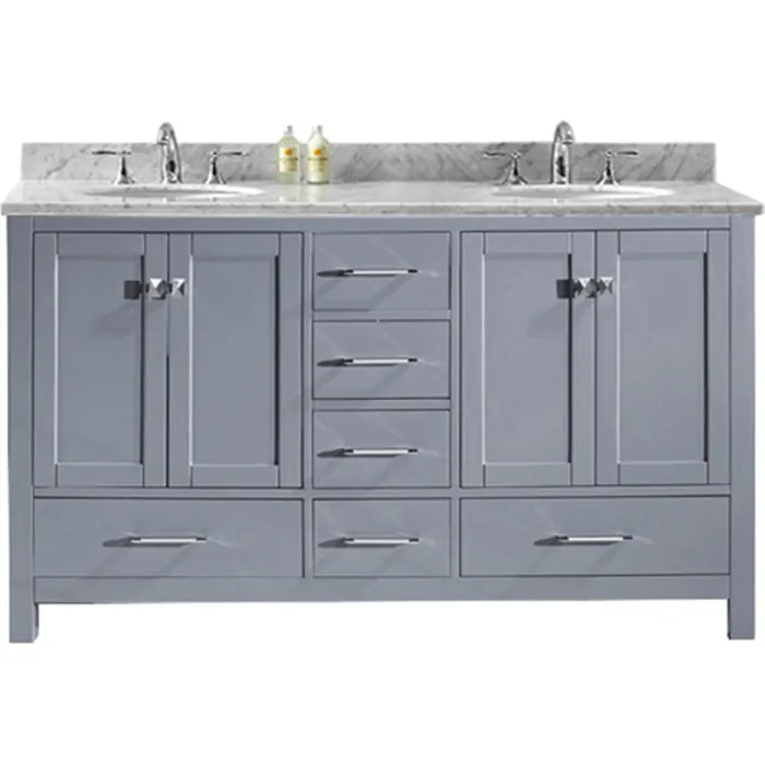 The Caroline Avenue vanity collection emanates an understated elegance that brings beauty and grace to just about any living space. Contemporary shaker style doors and clean lines make it a versatile addition to modern or transitional designs while offering bountiful storage as to not sacrifice functionality. Soft-closing door hinges and drawer glides provide added luxury, safety, and longevity. Each Caroline Avenue vanity is handcrafted with a 2" solid wood birch frame built to last a lifetime.The Caroline Avenue vanity collection emanates an understated elegance that brings beauty and grace to just about any living space.Contemporary shaker style doors and clean lines make it a versatile addition to modern or transitional designs while offering bountiful storage as to not sacrifice functionality.Functional & Versatile - Soft-closing door hinges and drawer glides provide added luxury, safety, and longevity. Each Caroline Avenue vanity is handcrafted with a 2" solid wood birch frame built to last a lifetime.Imported Italian Carrara marble countertop is included. Each countertop is cut from natural white marble with gray veining that ensures no two are exactly alike. Our marble countertops are pre-drilled and pre-sealed for added convenience and resilience.Easy Installation - Base cabinet is fully assembled and ready to be installed.Bathroom Vanity Set - This vanity kit includes cabinet, sinks, and countertop. Components have been expertly designed and engineered for optimal stylistic fit and compatibility with this particular cabinet.Sized For Fit & Storage - 60 in. W x 22 in. D x 34.25 in. HIncludes - 60" Gray Cabinet, Italian Carrara White Marble Countertop, 2 Round Undermount SinksAmple Storage - 4 Total Functional Soft-Close Doors and 6 Total Functional Soft-Close Drawers