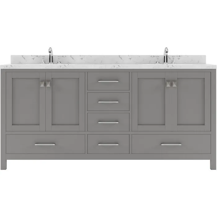 The Caroline Avenue vanity collection emanates an understated elegance that brings beauty and grace to just about any living space. Contemporary shaker style doors and clean lines make it a versatile addition to modern or transitional designs while offering bountiful storage as to not sacrifice functionality. Soft-closing door hinges and drawer glides provide added luxury, safety, and longevity. Each Caroline Avenue vanity is handcrafted with a 2" solid wood birch frame built to last a lifetime.The Caroline Avenue vanity collection emanates an understated elegance that brings beauty and grace to just about any living space.Contemporary shaker style doors and clean lines make it a versatile addition to modern or transitional designs while offering bountiful storage as to not sacrifice functionality.Functional & Versatile - Soft-closing door hinges and drawer glides provide added luxury, safety, and longevity. Each Caroline Avenue vanity is handcrafted with a 2" solid wood birch frame built to last a lifetime.Vanity kit includes quartz countertop in Cultured Marble. Unmatched in resilience, this countertop is non-porous and extremely resistant to impact, stains, and scratches. Conveniently pre-drilled for ease of installation and never requires sealing.Easy Installation - Base cabinet is fully assembled and ready to be installed.Bathroom Vanity Set - This vanity kit includes cabinet, sinks, and countertop. Components have been expertly designed and engineered for optimal stylistic fit and compatibility with this particular cabinet.Sized For Fit & Storage - 72 in. W x 22 in. D x 35 in. HIncludes - 72" Gray Cabinet, Cultured Marble Quartz Countertop, 2 Round Undermount SinksAmple Storage - 4 Total Functional Soft-Close Doors and 5 Total Functional Soft-Close Drawers