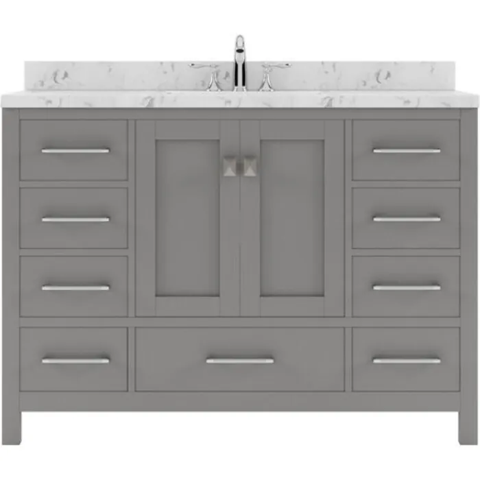 The Caroline Avenue vanity collection emanates an understated elegance that brings beauty and grace to just about any living space. Contemporary shaker style doors and clean lines make it a versatile addition to modern or transitional designs while offering bountiful storage as to not sacrifice functionality. Soft-closing door hinges and drawer glides provide added luxury, safety, and longevity. Each Caroline Avenue vanity is handcrafted with a 2" solid wood birch frame built to last a lifetime.The Caroline Avenue vanity collection emanates an understated elegance that brings beauty and grace to just about any living space.Contemporary shaker style doors and clean lines make it a versatile addition to modern or transitional designs while offering bountiful storage as to not sacrifice functionality.Functional & Versatile - Soft-closing door hinges and drawer glides provide added luxury, safety, and longevity. Each Caroline Avenue vanity is handcrafted with a 2" solid wood birch frame built to last a lifetime.Vanity kit includes quartz countertop in Cultured Marble. Unmatched in resilience, this countertop is non-porous and extremely resistant to impact, stains, and scratches. Conveniently pre-drilled for ease of installation and never requires sealing.Easy Installation - Base cabinet is fully assembled and ready to be installed.Bathroom Vanity Set - This vanity kit includes cabinet, sink, and countertop. Components have been expertly designed and engineered for optimal stylistic fit and compatibility with this particular cabinet.Sized For Fit & Storage - 48 in. W x 22 in. D x 35 in. HIncludes - 48" Gray Cabinet, Cultured Marble Quartz Countertop, 1 Round Undermount SinkAmple Storage - 2 Total Functional Soft-Close Doors and 7 Total Functional Soft-Close Drawers