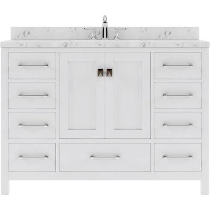 The Caroline Avenue vanity collection emanates an understated elegance that brings beauty and grace to just about any living space. Contemporary shaker style doors and clean lines make it a versatile addition to modern or transitional designs while offering bountiful storage as to not sacrifice functionality. Soft-closing door hinges and drawer glides provide added luxury, safety, and longevity. Each Caroline Avenue vanity is handcrafted with a 2" solid wood birch frame built to last a lifetime.The Caroline Avenue vanity collection emanates an understated elegance that brings beauty and grace to just about any living space.Contemporary shaker style doors and clean lines make it a versatile addition to modern or transitional designs while offering bountiful storage as to not sacrifice functionality.Functional & Versatile - Soft-closing door hinges and drawer glides provide added luxury, safety, and longevity. Each Caroline Avenue vanity is handcrafted with a 2" solid wood birch frame built to last a lifetime.Vanity kit includes quartz countertop in Cultured Marble. Unmatched in resilience, this countertop is non-porous and extremely resistant to impact, stains, and scratches. Conveniently pre-drilled for ease of installation and never requires sealing.Easy Installation - Base cabinet is fully assembled and ready to be installed.Bathroom Vanity Set - This vanity kit includes cabinet, sink, and countertop. Components have been expertly designed and engineered for optimal stylistic fit and compatibility with this particular cabinet.Sized For Fit & Storage - 48 in. W x 22 in. D x 35 in. HIncludes - 48" White Cabinet, Cultured Marble Quartz Countertop, 1 Square Undermount SinkAmple Storage - 2 Total Functional Soft-Close Doors and 7 Total Functional Soft-Close Drawers