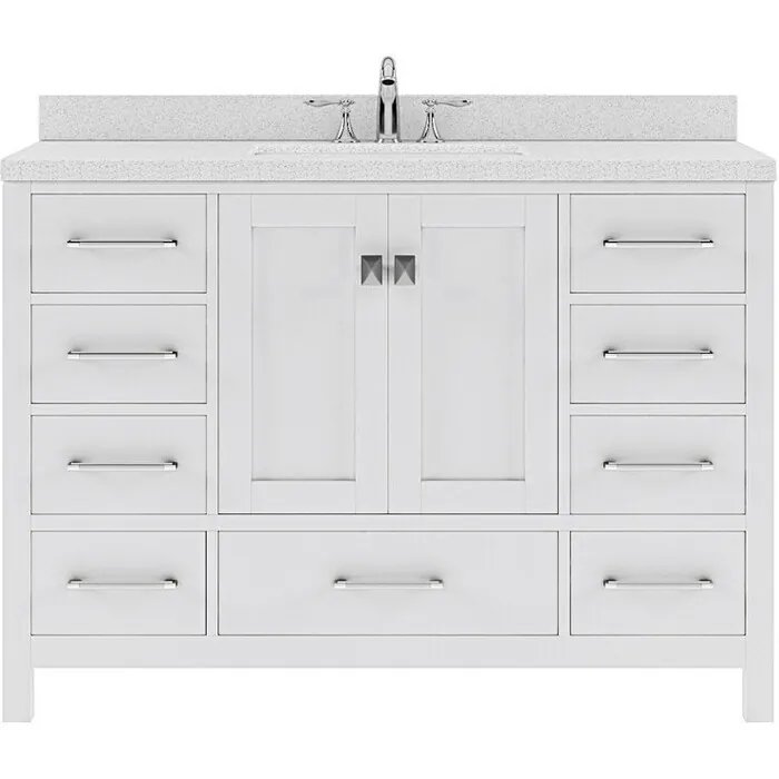 The Caroline Avenue vanity collection emanates an understated elegance that brings beauty and grace to just about any living space. Contemporary shaker style doors and clean lines make it a versatile addition to modern or transitional designs while offering bountiful storage as to not sacrifice functionality. Soft-closing door hinges and drawer glides provide added luxury, safety, and longevity. Each Caroline Avenue vanity is handcrafted with a 2" solid wood birch frame built to last a lifetime.The Caroline Avenue vanity collection emanates an understated elegance that brings beauty and grace to just about any living space.Contemporary shaker style doors and clean lines make it a versatile addition to modern or transitional designs while offering bountiful storage as to not sacrifice functionality.Functional & Versatile - Soft-closing door hinges and drawer glides provide added luxury, safety, and longevity. Each Caroline Avenue vanity is handcrafted with a 2" solid wood birch frame built to last a lifetime.Vanity kit includes quartz countertop in Dazzle White. Unmatched in resilience, this countertop is non-porous and extremely resistant to impact, stains, and scratches. Conveniently pre-drilled for ease of installation and never requires sealing.Easy Installation - Base cabinet is fully assembled and ready to be installed.Bathroom Vanity Set - This vanity kit includes cabinet, sink, and countertop. Components have been expertly designed and engineered for optimal stylistic fit and compatibility with this particular cabinet.Sized For Fit & Storage - 48 in. W x 22 in. D x 35 in. HIncludes - 48" White Cabinet, Dazzle White Quartz Countertop, 1 Square Undermount SinkAmple Storage - 2 Total Functional Soft-Close Doors and 7 Total Functional Soft-Close Drawers