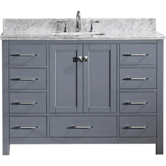 The Caroline Avenue vanity collection emanates an understated elegance that brings beauty and grace to just about any living space. Contemporary shaker style doors and clean lines make it a versatile addition to modern or transitional designs while offering bountiful storage as to not sacrifice functionality. Soft-closing door hinges and drawer glides provide added luxury, safety, and longevity. Each Caroline Avenue vanity is handcrafted with a 2" solid wood birch frame built to last a lifetime.The Caroline Avenue vanity collection emanates an understated elegance that brings beauty and grace to just about any living space.Contemporary shaker style doors and clean lines make it a versatile addition to modern or transitional designs while offering bountiful storage as to not sacrifice functionality.Functional & Versatile - Soft-closing door hinges and drawer glides provide added luxury, safety, and longevity. Each Caroline Avenue vanity is handcrafted with a 2" solid wood birch frame built to last a lifetime.Imported Italian Carrara marble countertop is included. Each countertop is cut from natural white marble with gray veining that ensures no two are exactly alike. Our marble countertops are pre-drilled and pre-sealed for added convenience and resilience.Easy Installation - Base cabinet is fully assembled and ready to be installed.Bathroom Vanity Set - This vanity kit includes cabinet, sink, and countertop. Components have been expertly designed and engineered for optimal stylistic fit and compatibility with this particular cabinet.Sized For Fit & Storage - 48 in. W x 22 in. D x 34.25 in. HIncludes - 48" Gray Cabinet, Italian Carrara White Marble Countertop, 1 Square Undermount SinkAmple Storage - 2 Total Functional Soft-Close Doors and 7 Total Functional Soft-Close Drawers