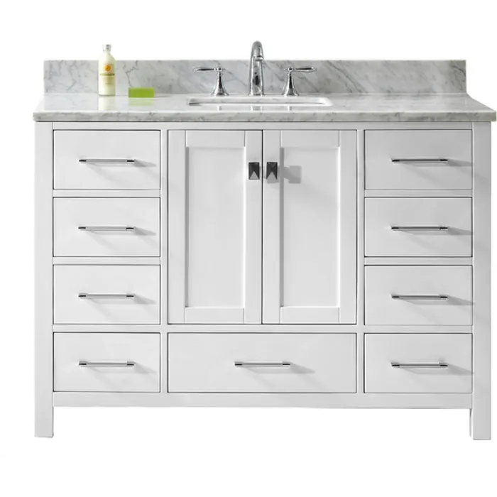 The Caroline Avenue vanity collection emanates an understated elegance that brings beauty and grace to just about any living space. Contemporary shaker style doors and clean lines make it a versatile addition to modern or transitional designs while offering bountiful storage as to not sacrifice functionality. Soft-closing door hinges and drawer glides provide added luxury, safety, and longevity. Each Caroline Avenue vanity is handcrafted with a 2" solid wood birch frame built to last a lifetime.The Caroline Avenue vanity collection emanates an understated elegance that brings beauty and grace to just about any living space.Contemporary shaker style doors and clean lines make it a versatile addition to modern or transitional designs while offering bountiful storage as to not sacrifice functionality.Functional & Versatile - Soft-closing door hinges and drawer glides provide added luxury, safety, and longevity. Each Caroline Avenue vanity is handcrafted with a 2" solid wood birch frame built to last a lifetime.Imported Italian Carrara marble countertop is included. Each countertop is cut from natural white marble with gray veining that ensures no two are exactly alike. Our marble countertops are pre-drilled and pre-sealed for added convenience and resilience.Easy Installation - Base cabinet is fully assembled and ready to be installed.Bathroom Vanity Set - This vanity kit includes cabinet, sink, and countertop. Components have been expertly designed and engineered for optimal stylistic fit and compatibility with this particular cabinet.Sized For Fit & Storage - 48 in. W x 22 in. D x 34.25 in. HIncludes - 48" White Cabinet, Italian Carrara White Marble Countertop, 1 Square Undermount SinkAmple Storage - 2 Total Functional Soft-Close Doors and 7 Total Functional Soft-Close Drawers