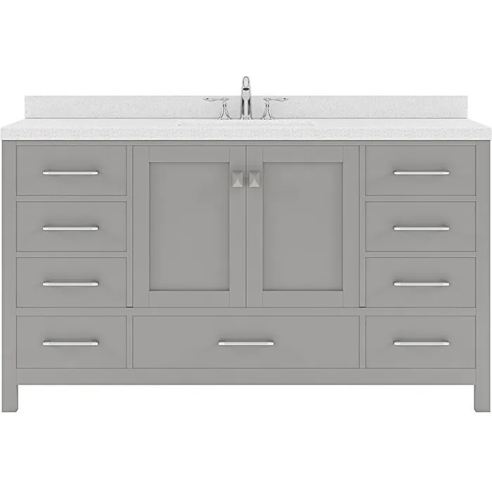 The Caroline Avenue vanity collection emanates an understated elegance that brings beauty and grace to just about any living space. Contemporary shaker style doors and clean lines make it a versatile addition to modern or transitional designs while offering bountiful storage as to not sacrifice functionality. Soft-closing door hinges and drawer glides provide added luxury, safety, and longevity. Each Caroline Avenue vanity is handcrafted with a 2" solid wood birch frame built to last a lifetime.The Caroline Avenue vanity collection emanates an understated elegance that brings beauty and grace to just about any living space.Contemporary shaker style doors and clean lines make it a versatile addition to modern or transitional designs while offering bountiful storage as to not sacrifice functionality.Functional & Versatile - Soft-closing door hinges and drawer glides provide added luxury, safety, and longevity. Each Caroline Avenue vanity is handcrafted with a 2" solid wood birch frame built to last a lifetime.Vanity kit includes quartz countertop in Dazzle White. Unmatched in resilience, this countertop is non-porous and extremely resistant to impact, stains, and scratches. Conveniently pre-drilled for ease of installation and never requires sealing.Easy Installation - Base cabinet is fully assembled and ready to be installed.Bathroom Vanity Set - This vanity kit includes cabinet, sink, and countertop. Components have been expertly designed and engineered for optimal stylistic fit and compatibility with this particular cabinet.Sized For Fit & Storage - 60 in. W x 22 in. D x 35 in. HIncludes - 60" Gray Cabinet, Dazzle White Quartz Countertop, 1 Square Undermount SinkAmple Storage - 2 Total Functional Soft-Close Doors and 7 Total Functional Soft-Close Drawers