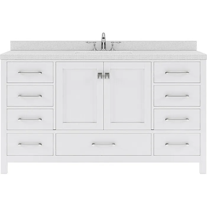 The Caroline Avenue vanity collection emanates an understated elegance that brings beauty and grace to just about any living space. Contemporary shaker style doors and clean lines make it a versatile addition to modern or transitional designs while offering bountiful storage as to not sacrifice functionality. Soft-closing door hinges and drawer glides provide added luxury, safety, and longevity. Each Caroline Avenue vanity is handcrafted with a 2" solid wood birch frame built to last a lifetime.The Caroline Avenue vanity collection emanates an understated elegance that brings beauty and grace to just about any living space.Contemporary shaker style doors and clean lines make it a versatile addition to modern or transitional designs while offering bountiful storage as to not sacrifice functionality.Functional & Versatile - Soft-closing door hinges and drawer glides provide added luxury, safety, and longevity. Each Caroline Avenue vanity is handcrafted with a 2" solid wood birch frame built to last a lifetime.Vanity kit includes quartz countertop in Dazzle White. Unmatched in resilience, this countertop is non-porous and extremely resistant to impact, stains, and scratches. Conveniently pre-drilled for ease of installation and never requires sealing.Easy Installation - Base cabinet is fully assembled and ready to be installed.Bathroom Vanity Set - This vanity kit includes cabinet, sink, and countertop. Components have been expertly designed and engineered for optimal stylistic fit and compatibility with this particular cabinet.Sized For Fit & Storage - 60 in. W x 22 in. D x 35 in. HIncludes - 60" White Cabinet, Dazzle White Quartz Countertop, 1 Square Undermount SinkAmple Storage - 2 Total Functional Soft-Close Doors and 7 Total Functional Soft-Close Drawers