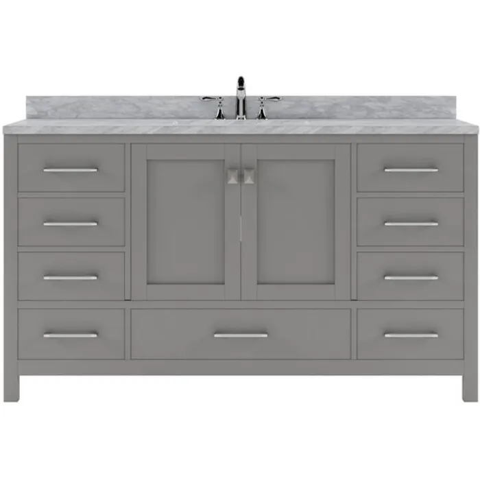 The Caroline Avenue vanity collection emanates an understated elegance that brings beauty and grace to just about any living space. Contemporary shaker style doors and clean lines make it a versatile addition to modern or transitional designs while offering bountiful storage as to not sacrifice functionality. Soft-closing door hinges and drawer glides provide added luxury, safety, and longevity. Each Caroline Avenue vanity is handcrafted with a 2" solid wood birch frame built to last a lifetime.The Caroline Avenue vanity collection emanates an understated elegance that brings beauty and grace to just about any living space.Contemporary shaker style doors and clean lines make it a versatile addition to modern or transitional designs while offering bountiful storage as to not sacrifice functionality.Functional & Versatile - Soft-closing door hinges and drawer glides provide added luxury, safety, and longevity. Each Caroline Avenue vanity is handcrafted with a 2" solid wood birch frame built to last a lifetime.Imported Italian Carrara marble countertop is included. Each countertop is cut from natural white marble with gray veining that ensures no two are exactly alike. Our marble countertops are pre-drilled and pre-sealed for added convenience and resilience.Easy Installation - Base cabinet is fully assembled and ready to be installed.Bathroom Vanity Set - This vanity kit includes cabinet, sink, and countertop. Components have been expertly designed and engineered for optimal stylistic fit and compatibility with this particular cabinet.Sized For Fit & Storage - 60 in. W x 22 in. D x 34.25 in. HIncludes - 60" Gray Cabinet, Italian Carrara White Marble Countertop, 1 Round Undermount SinkAmple Storage - 2 Total Functional Soft-Close Doors and 7 Total Functional Soft-Close Drawers