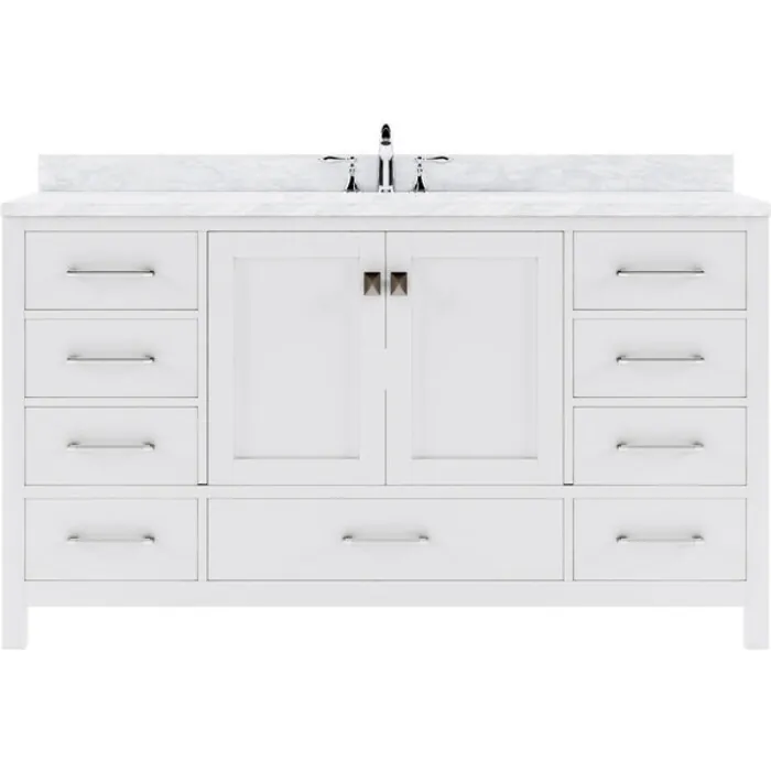 The Caroline Avenue vanity collection emanates an understated elegance that brings beauty and grace to just about any living space. Contemporary shaker style doors and clean lines make it a versatile addition to modern or transitional designs while offering bountiful storage as to not sacrifice functionality. Soft-closing door hinges and drawer glides provide added luxury, safety, and longevity. Each Caroline Avenue vanity is handcrafted with a 2" solid wood birch frame built to last a lifetime.The Caroline Avenue vanity collection emanates an understated elegance that brings beauty and grace to just about any living space.Contemporary shaker style doors and clean lines make it a versatile addition to modern or transitional designs while offering bountiful storage as to not sacrifice functionality.Functional & Versatile - Soft-closing door hinges and drawer glides provide added luxury, safety, and longevity. Each Caroline Avenue vanity is handcrafted with a 2" solid wood birch frame built to last a lifetime.Imported Italian Carrara marble countertop is included. Each countertop is cut from natural white marble with gray veining that ensures no two are exactly alike. Our marble countertops are pre-drilled and pre-sealed for added convenience and resilience.Easy Installation - Base cabinet is fully assembled and ready to be installed.Bathroom Vanity Set - This vanity kit includes cabinet, sink, and countertop. Components have been expertly designed and engineered for optimal stylistic fit and compatibility with this particular cabinet.Sized For Fit & Storage - 60 in. W x 22 in. D x 34.25 in. HIncludes - 60" White Cabinet, Italian Carrara White Marble Countertop, 1 Round Undermount SinkAmple Storage - 2 Total Functional Soft-Close Doors and 7 Total Functional Soft-Close Drawers