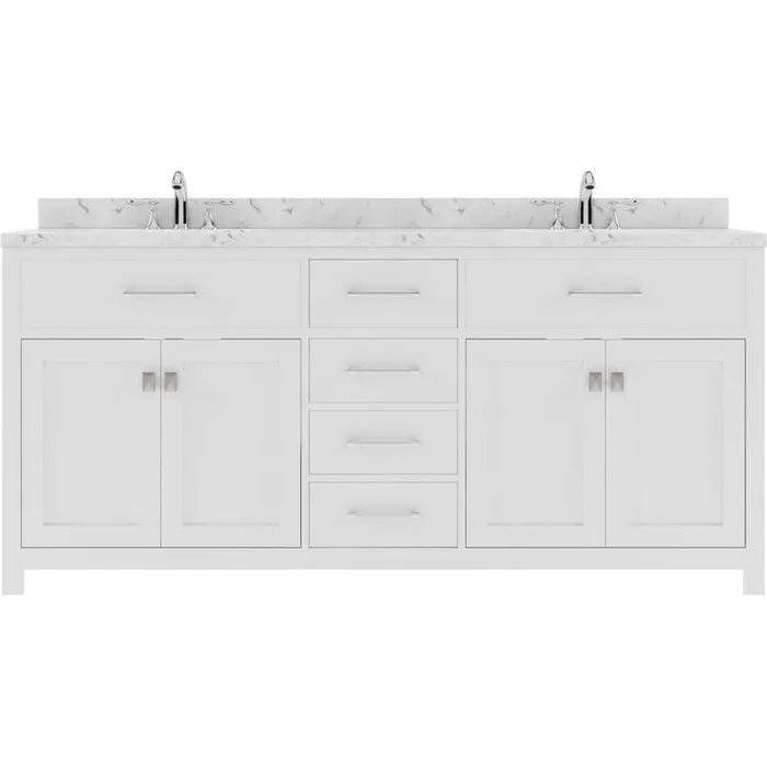 Our flagship Caroline vanity collection emanates an understated elegance that brings beauty and grace to just about any living space. Contemporary shaker style doors and clean lines make it a versatile addition to modern or transitional designs while offering bountiful storage as to not sacrifice functionality. Soft-closing door hinges and drawer glides provide added luxury, safety, and longevity. Each Caroline vanity is handcrafted with a 2" solid wood birch frame built to last a lifetime.Our flagship Caroline vanity collection emanates an understated elegance that brings beauty and grace to just about any living space.Contemporary shaker style doors and clean lines make it a versatile addition to modern or transitional designs while offering bountiful storage as to not sacrifice functionality.Functional & Versatile - Soft-closing door hinges and drawer glides provide added luxury, safety, and longevity. Each Caroline vanity is handcrafted with a 2" solid wood birch frame built to last a lifetime.Vanity kit includes quartz countertop in Cultured Marble. Unmatched in resilience, this countertop is non-porous and extremely resistant to impact, stains, and scratches. Conveniently pre-drilled for ease of installation and never requires sealing.Easy Installation - Base cabinet is fully assembled and ready to be installed.Bathroom Vanity Set - This vanity kit includes cabinet, sinks, and countertop. Components have been expertly designed and engineered for optimal stylistic fit and compatibility with this particular cabinet.Sized For Fit & Storage - 72 in. W x 22 in. D x 35 in. HIncludes - 72" White Cabinet, Cultured Marble Quartz Countertop, 2 Round Undermount SinksAmple Storage - 4 Total Functional Soft-Close Doors and 3 Total Functional Soft-Close Drawers