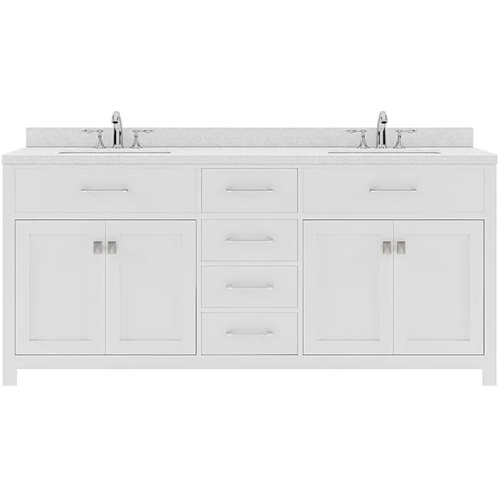Our flagship Caroline vanity collection emanates an understated elegance that brings beauty and grace to just about any living space. Contemporary shaker style doors and clean lines make it a versatile addition to modern or transitional designs while offering bountiful storage as to not sacrifice functionality. Soft-closing door hinges and drawer glides provide added luxury, safety, and longevity. Each Caroline vanity is handcrafted with a 2" solid wood birch frame built to last a lifetime.Our flagship Caroline vanity collection emanates an understated elegance that brings beauty and grace to just about any living space.Contemporary shaker style doors and clean lines make it a versatile addition to modern or transitional designs while offering bountiful storage as to not sacrifice functionality.Functional & Versatile - Soft-closing door hinges and drawer glides provide added luxury, safety, and longevity. Each Caroline vanity is handcrafted with a 2" solid wood birch frame built to last a lifetime.Vanity kit includes quartz countertop in Dazzle White. Unmatched in resilience, this countertop is non-porous and extremely resistant to impact, stains, and scratches. Conveniently pre-drilled for ease of installation and never requires sealing.Easy Installation - Base cabinet is fully assembled and ready to be installed.Bathroom Vanity Set - This vanity kit includes cabinet, sinks, and countertop. Components have been expertly designed and engineered for optimal stylistic fit and compatibility with this particular cabinet.Sized For Fit & Storage - 72 in. W x 22 in. D x 35 in. HIncludes - 72" White Cabinet, Dazzle White Quartz Countertop, 2 Square Undermount SinksAmple Storage - 4 Total Functional Soft-Close Doors and 3 Total Functional Soft-Close Drawers