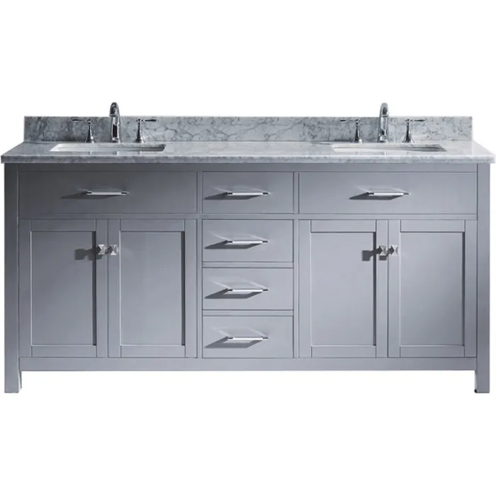 Our flagship Caroline vanity collection emanates an understated elegance that brings beauty and grace to just about any living space. Contemporary shaker style doors and clean lines make it a versatile addition to modern or transitional designs while offering bountiful storage as to not sacrifice functionality. Soft-closing door hinges and drawer glides provide added luxury, safety, and longevity. Each Caroline vanity is handcrafted with a 2" solid wood birch frame built to last a lifetime.Our flagship Caroline vanity collection emanates an understated elegance that brings beauty and grace to just about any living space.Contemporary shaker style doors and clean lines make it a versatile addition to modern or transitional designs while offering bountiful storage as to not sacrifice functionality.Functional & Versatile - Soft-closing door hinges and drawer glides provide added luxury, safety, and longevity. Each Caroline vanity is handcrafted with a 2" solid wood birch frame built to last a lifetime.Imported Italian Carrara marble countertop is included. Each countertop is cut from natural white marble with gray veining that ensures no two are exactly alike. Our marble countertops are pre-drilled and pre-sealed for added convenience and resilience.Easy Installation - Base cabinet is fully assembled and ready to be installed.Bathroom Vanity Set - This vanity kit includes cabinet, sinks, and countertop. Components have been expertly designed and engineered for optimal stylistic fit and compatibility with this particular cabinet.Sized For Fit & Storage - 72 in. W x 22 in. D x 34.25 in. HIncludes - 72" Gray Cabinet, Italian Carrara White Marble Countertop, 2 Square Undermount SinksAmple Storage - 4 Total Functional Soft-Close Doors and 4 Total Functional Soft-Close Drawers