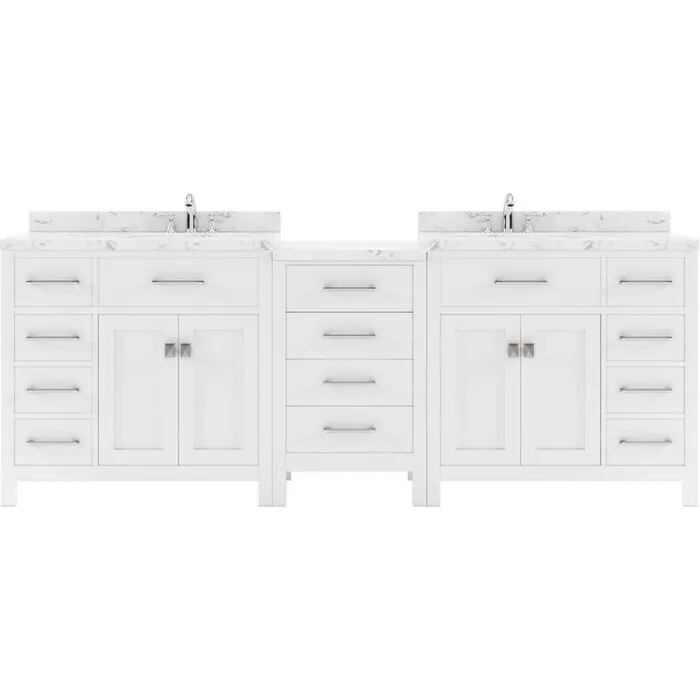 The Caroline Parkway vanity collection emanates an understated elegance that brings beauty and grace to just about any living space. Contemporary shaker style doors and clean lines make it a great addition to modern or transitional designs while offering bountiful storage as to not sacrifice functionality. The modular design is both eye-catching and phenomenally versatile. Soft-closing door hinges and drawer glides provide added luxury, safety, and longevity. Each Caroline Parkway vanity is handcrafted with a 2" solid wood birch frame built to last a lifetime.The Caroline Parkway vanity collection emanates an understated elegance that brings beauty and grace to just about any living space.Contemporary shaker style doors and clean lines make it a great addition to modern or transitional designs while offering bountiful storage as to not sacrifice functionality. The modular design is both eye-catching and phenomenally versatile.Functional & Versatile - Soft-closing door hinges and drawer glides provide added luxury, safety, and longevity. Each Caroline Parkway vanity is handcrafted with a 2" solid wood birch frame built to last a lifetime.Vanity kit includes quartz countertop in Cultured Marble. Unmatched in resilience, this countertop is non-porous and extremely resistant to impact, stains, and scratches. Conveniently pre-drilled for ease of installation and never requires sealing.Easy Installation - Base cabinet is fully assembled and ready to be installed.Bathroom Vanity Set - This vanity kit includes cabinet, sinks, and countertop. Components have been expertly designed and engineered for optimal stylistic fit and compatibility with this particular cabinet.Sized For Fit & Storage - 93 in. W x 22 in. D x 35 in. HIncludes - 93" White Cabinet, Cultured Marble Quartz Countertop, 2 Square Undermount SinksAmple Storage - 4 Total Functional Soft-Close Doors and 12 Total Functional Soft-Close Drawers
