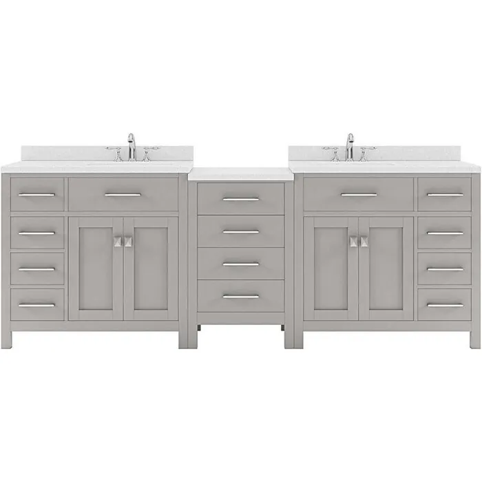 The Caroline Parkway vanity collection emanates an understated elegance that brings beauty and grace to just about any living space. Contemporary shaker style doors and clean lines make it a great addition to modern or transitional designs while offering bountiful storage as to not sacrifice functionality. The modular design is both eye-catching and phenomenally versatile. Soft-closing door hinges and drawer glides provide added luxury, safety, and longevity. Each Caroline Parkway vanity is handcrafted with a 2" solid wood birch frame built to last a lifetime.The Caroline Parkway vanity collection emanates an understated elegance that brings beauty and grace to just about any living space.Contemporary shaker style doors and clean lines make it a great addition to modern or transitional designs while offering bountiful storage as to not sacrifice functionality. The modular design is both eye-catching and phenomenally versatile.Functional & Versatile - Soft-closing door hinges and drawer glides provide added luxury, safety, and longevity. Each Caroline Parkway vanity is handcrafted with a 2" solid wood birch frame built to last a lifetime.Vanity kit includes quartz countertop in Dazzle White. Unmatched in resilience, this countertop is non-porous and extremely resistant to impact, stains, and scratches. Conveniently pre-drilled for ease of installation and never requires sealing.Easy Installation - Base cabinet is fully assembled and ready to be installed.Bathroom Vanity Set - This vanity kit includes cabinet, sinks, and countertop. Components have been expertly designed and engineered for optimal stylistic fit and compatibility with this particular cabinet.Sized For Fit & Storage - 93 in. W x 22 in. D x 35 in. HIncludes - 93" Gray Cabinet, Dazzle White Quartz Countertop, 2 Square Undermount SinksAmple Storage - 4 Total Functional Soft-Close Doors and 4 Total Functional Soft-Close Drawers