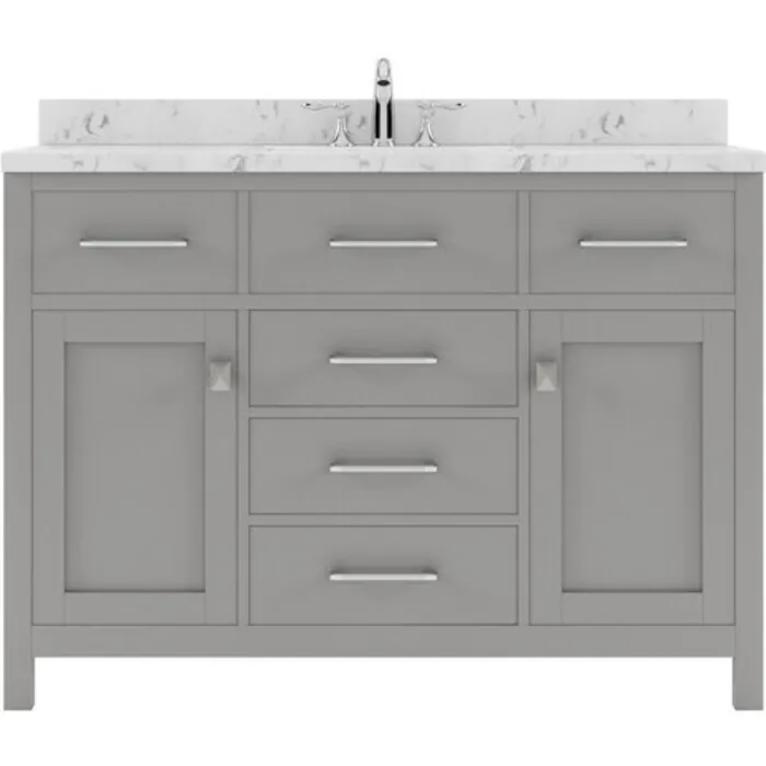 Our flagship Caroline vanity collection emanates an understated elegance that brings beauty and grace to just about any living space. Contemporary shaker style doors and clean lines make it a versatile addition to modern or transitional designs while offering bountiful storage as to not sacrifice functionality. Soft-closing door hinges and drawer glides provide added luxury, safety, and longevity. Each Caroline vanity is handcrafted with a 2" solid wood birch frame built to last a lifetime.Our flagship Caroline vanity collection emanates an understated elegance that brings beauty and grace to just about any living space.Contemporary shaker style doors and clean lines make it a versatile addition to modern or transitional designs while offering bountiful storage as to not sacrifice functionality.Functional & Versatile - Soft-closing door hinges and drawer glides provide added luxury, safety, and longevity. Each Caroline vanity is handcrafted with a 2" solid wood birch frame built to last a lifetime.Vanity kit includes quartz countertop in Cultured Marble. Unmatched in resilience, this countertop is non-porous and extremely resistant to impact, stains, and scratches. Conveniently pre-drilled for ease of installation and never requires sealing.Easy Installation - Base cabinet is fully assembled and ready to be installed.Bathroom Vanity Set - This vanity kit includes cabinet, sink, and countertop. Components have been expertly designed and engineered for optimal stylistic fit and compatibility with this particular cabinet.Sized For Fit & Storage - 48 in. W x 22 in. D x 35 in. HIncludes - 48" Gray Cabinet, Cultured Marble Quartz Countertop, 1 Round Undermount SinkAmple Storage - 2 Total Functional Soft-Close Doors and 3 Total Functional Soft-Close Drawers