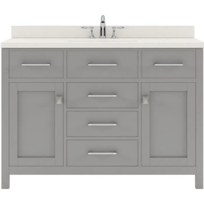 Our flagship Caroline vanity collection emanates an understated elegance that brings beauty and grace to just about any living space. Contemporary shaker style doors and clean lines make it a versatile addition to modern or transitional designs while offering bountiful storage as to not sacrifice functionality. Soft-closing door hinges and drawer glides provide added luxury, safety, and longevity. Each Caroline vanity is handcrafted with a 2" solid wood birch frame built to last a lifetime.Our flagship Caroline vanity collection emanates an understated elegance that brings beauty and grace to just about any living space.Contemporary shaker style doors and clean lines make it a versatile addition to modern or transitional designs while offering bountiful storage as to not sacrifice functionality.Functional & Versatile - Soft-closing door hinges and drawer glides provide added luxury, safety, and longevity. Each Caroline vanity is handcrafted with a 2" solid wood birch frame built to last a lifetime.Vanity kit includes quartz countertop in Dazzle White. Unmatched in resilience, this countertop is non-porous and extremely resistant to impact, stains, and scratches. Conveniently pre-drilled for ease of installation and never requires sealing.Easy Installation - Base cabinet is fully assembled and ready to be installed.Bathroom Vanity Set - This vanity kit includes cabinet, sink, and countertop. Components have been expertly designed and engineered for optimal stylistic fit and compatibility with this particular cabinet.Sized For Fit & Storage - 48 in. W x 22 in. D x 35 in. HIncludes - 48" Gray Cabinet, Dazzle White Quartz Countertop, 1 Round Undermount SinkAmple Storage - 2 Total Functional Soft-Close Doors and 3 Total Functional Soft-Close Drawers