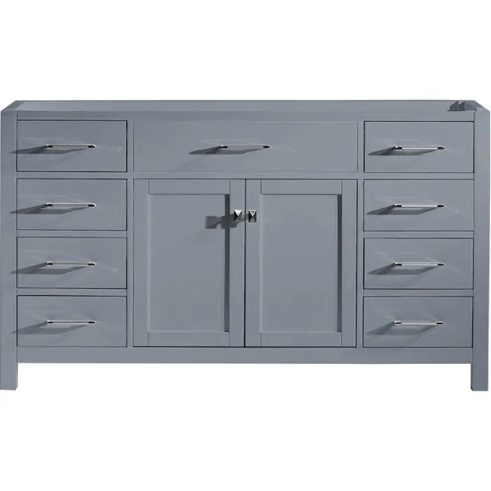 Our flagship Caroline vanity collection emanates an understated elegance that brings beauty and grace to just about any living space. Contemporary shaker style doors and clean lines make it a versatile addition to modern or transitional designs while offering bountiful storage as to not sacrifice functionality. Soft-closing door hinges and drawer glides provide added luxury, safety, and longevity. Each Caroline vanity is handcrafted with a 2" solid wood birch frame built to last a lifetime.Our flagship Caroline vanity collection emanates an understated elegance that brings beauty and grace to just about any living space.Contemporary shaker style doors and clean lines make it a versatile addition to modern or transitional designs while offering bountiful storage as to not sacrifice functionality.Functional & Versatile - Soft-closing door hinges and drawer glides provide added luxury, safety, and longevity. Each Caroline vanity is handcrafted with a 2" solid wood birch frame built to last a lifetime.Easy Installation - Base cabinet is fully assembled and ready to be installed.Cabinet Only - High quality cabinet for you to customize as you see fitSized For Fit & Storage - 60 in. W x 22 in. D x 33.5 in. HIncludes - 60" Gray CabinetAmple Storage - 2 Total Functional Soft-Close Doors and 6 Total Functional Soft-Close Drawers