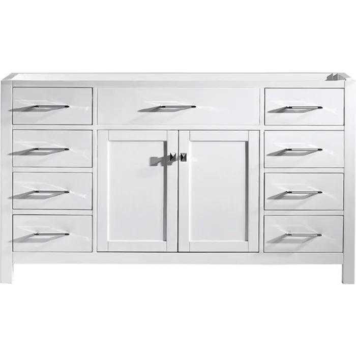 Our flagship Caroline vanity collection emanates an understated elegance that brings beauty and grace to just about any living space. Contemporary shaker style doors and clean lines make it a versatile addition to modern or transitional designs while offering bountiful storage as to not sacrifice functionality. Soft-closing door hinges and drawer glides provide added luxury, safety, and longevity. Each Caroline vanity is handcrafted with a 2" solid wood birch frame built to last a lifetime.Our flagship Caroline vanity collection emanates an understated elegance that brings beauty and grace to just about any living space.Contemporary shaker style doors and clean lines make it a versatile addition to modern or transitional designs while offering bountiful storage as to not sacrifice functionality.Functional & Versatile - Soft-closing door hinges and drawer glides provide added luxury, safety, and longevity. Each Caroline vanity is handcrafted with a 2" solid wood birch frame built to last a lifetime.Easy Installation - Base cabinet is fully assembled and ready to be installed.Cabinet Only - High quality cabinet for you to customize as you see fitSized For Fit & Storage - 60 in. W x 22 in. D x 33.5 in. HIncludes - 60" White CabinetAmple Storage - 2 Total Functional Soft-Close Doors and 6 Total Functional Soft-Close Drawers