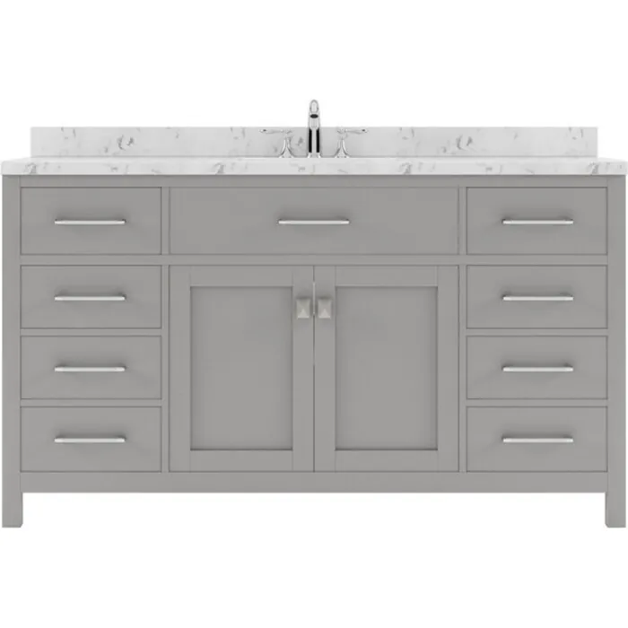 Our flagship Caroline vanity collection emanates an understated elegance that brings beauty and grace to just about any living space. Contemporary shaker style doors and clean lines make it a versatile addition to modern or transitional designs while offering bountiful storage as to not sacrifice functionality. Soft-closing door hinges and drawer glides provide added luxury, safety, and longevity. Each Caroline vanity is handcrafted with a 2" solid wood birch frame built to last a lifetime.Our flagship Caroline vanity collection emanates an understated elegance that brings beauty and grace to just about any living space.Contemporary shaker style doors and clean lines make it a versatile addition to modern or transitional designs while offering bountiful storage as to not sacrifice functionality.Functional & Versatile - Soft-closing door hinges and drawer glides provide added luxury, safety, and longevity. Each Caroline vanity is handcrafted with a 2" solid wood birch frame built to last a lifetime.Vanity kit includes quartz countertop in Cultured Marble. Unmatched in resilience, this countertop is non-porous and extremely resistant to impact, stains, and scratches. Conveniently pre-drilled for ease of installation and never requires sealing.Easy Installation - Base cabinet is fully assembled and ready to be installed.Bathroom Vanity Set - This vanity kit includes cabinet, sink, and countertop. Components have been expertly designed and engineered for optimal stylistic fit and compatibility with this particular cabinet.Sized For Fit & Storage - 60 in. W x 22 in. D x 35 in. HIncludes - 60" Gray Cabinet, Cultured Marble Quartz Countertop, 1 Round Undermount SinkAmple Storage - 2 Total Functional Soft-Close Doors and 6 Total Functional Soft-Close Drawers