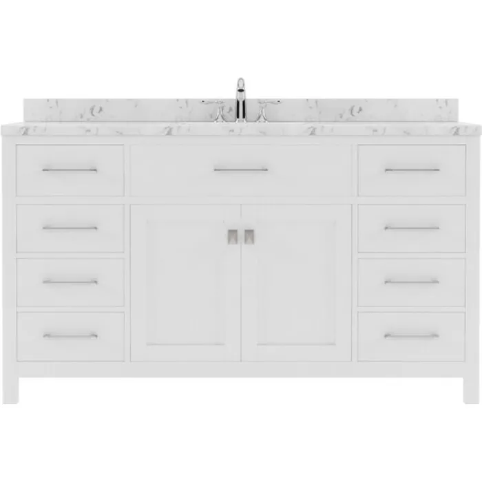 Our flagship Caroline vanity collection emanates an understated elegance that brings beauty and grace to just about any living space. Contemporary shaker style doors and clean lines make it a versatile addition to modern or transitional designs while offering bountiful storage as to not sacrifice functionality. Soft-closing door hinges and drawer glides provide added luxury, safety, and longevity. Each Caroline vanity is handcrafted with a 2" solid wood birch frame built to last a lifetime.Our flagship Caroline vanity collection emanates an understated elegance that brings beauty and grace to just about any living space.Contemporary shaker style doors and clean lines make it a versatile addition to modern or transitional designs while offering bountiful storage as to not sacrifice functionality.Functional & Versatile - Soft-closing door hinges and drawer glides provide added luxury, safety, and longevity. Each Caroline vanity is handcrafted with a 2" solid wood birch frame built to last a lifetime.Vanity kit includes quartz countertop in Cultured Marble. Unmatched in resilience, this countertop is non-porous and extremely resistant to impact, stains, and scratches. Conveniently pre-drilled for ease of installation and never requires sealing.Easy Installation - Base cabinet is fully assembled and ready to be installed.Bathroom Vanity Set - This vanity kit includes cabinet, sink, and countertop. Components have been expertly designed and engineered for optimal stylistic fit and compatibility with this particular cabinet.Sized For Fit & Storage - 60 in. W x 22 in. D x 35 in. HIncludes - 60" White Cabinet, Cultured Marble Quartz Countertop, 1 Round Undermount SinkAmple Storage - 2 Total Functional Soft-Close Doors and 6 Total Functional Soft-Close Drawers