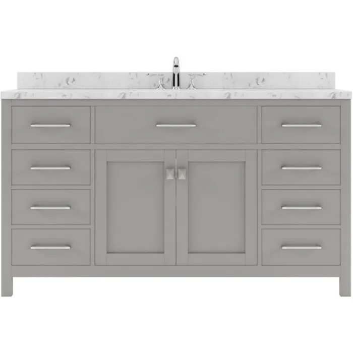 Our flagship Caroline vanity collection emanates an understated elegance that brings beauty and grace to just about any living space. Contemporary shaker style doors and clean lines make it a versatile addition to modern or transitional designs while offering bountiful storage as to not sacrifice functionality. Soft-closing door hinges and drawer glides provide added luxury, safety, and longevity. Each Caroline vanity is handcrafted with a 2" solid wood birch frame built to last a lifetime.Our flagship Caroline vanity collection emanates an understated elegance that brings beauty and grace to just about any living space.Contemporary shaker style doors and clean lines make it a versatile addition to modern or transitional designs while offering bountiful storage as to not sacrifice functionality.Functional & Versatile - Soft-closing door hinges and drawer glides provide added luxury, safety, and longevity. Each Caroline vanity is handcrafted with a 2" solid wood birch frame built to last a lifetime.Vanity kit includes quartz countertop in Cultured Marble. Unmatched in resilience, this countertop is non-porous and extremely resistant to impact, stains, and scratches. Conveniently pre-drilled for ease of installation and never requires sealing.Easy Installation - Base cabinet is fully assembled and ready to be installed.Bathroom Vanity Set - This vanity kit includes cabinet, sink, and countertop. Components have been expertly designed and engineered for optimal stylistic fit and compatibility with this particular cabinet.Sized For Fit & Storage - 60 in. W x 22 in. D x 35 in. HIncludes - 60" Gray Cabinet, Cultured Marble Quartz Countertop, 1 Square Undermount SinkAmple Storage - 2 Total Functional Soft-Close Doors and 6 Total Functional Soft-Close Drawers