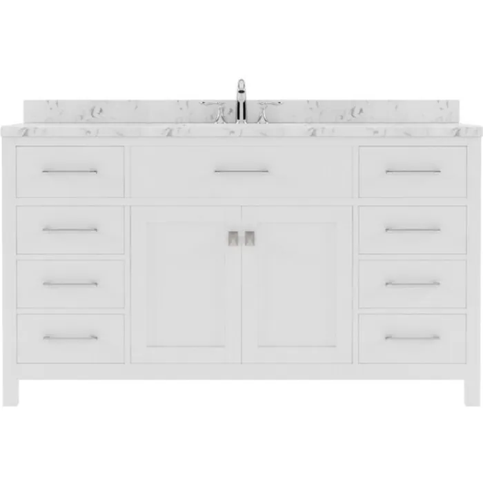 Our flagship Caroline vanity collection emanates an understated elegance that brings beauty and grace to just about any living space. Contemporary shaker style doors and clean lines make it a versatile addition to modern or transitional designs while offering bountiful storage as to not sacrifice functionality. Soft-closing door hinges and drawer glides provide added luxury, safety, and longevity. Each Caroline vanity is handcrafted with a 2" solid wood birch frame built to last a lifetime.Our flagship Caroline vanity collection emanates an understated elegance that brings beauty and grace to just about any living space.Contemporary shaker style doors and clean lines make it a versatile addition to modern or transitional designs while offering bountiful storage as to not sacrifice functionality.Functional & Versatile - Soft-closing door hinges and drawer glides provide added luxury, safety, and longevity. Each Caroline vanity is handcrafted with a 2" solid wood birch frame built to last a lifetime.Vanity kit includes quartz countertop in Cultured Marble. Unmatched in resilience, this countertop is non-porous and extremely resistant to impact, stains, and scratches. Conveniently pre-drilled for ease of installation and never requires sealing.Easy Installation - Base cabinet is fully assembled and ready to be installed.Bathroom Vanity Set - This vanity kit includes cabinet, sink, and countertop. Components have been expertly designed and engineered for optimal stylistic fit and compatibility with this particular cabinet.Sized For Fit & Storage - 60 in. W x 22 in. D x 35 in. HIncludes - 60" White Cabinet, Cultured Marble Quartz Countertop, 1 Square Undermount SinkAmple Storage - 2 Total Functional Soft-Close Doors and 6 Total Functional Soft-Close Drawers