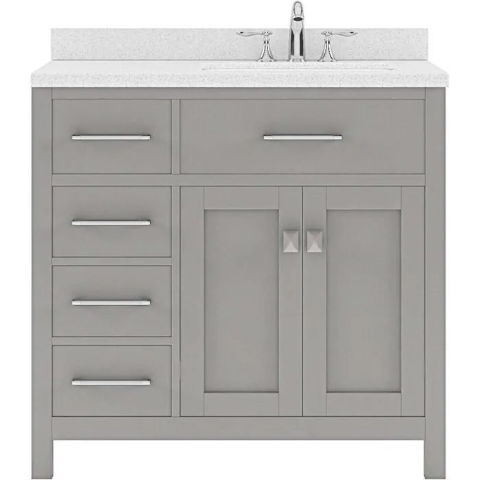 The Caroline Parkway vanity collection emanates an understated elegance that brings beauty and grace to just about any living space. Contemporary shaker style doors and clean lines make it a versatile addition to modern or transitional designs while offering bountiful storage as to not sacrifice functionality. Soft-closing door hinges and drawer glides provide added luxury, safety, and longevity. Each Caroline Parkway vanity is handcrafted with a 2" solid wood birch frame built to last a lifetime.The Caroline Parkway vanity collection emanates an understated elegance that brings beauty and grace to just about any living space.Contemporary shaker style doors and clean lines make it a versatile addition to modern or transitional designs while offering bountiful storage as to not sacrifice functionality.Functional & Versatile - Soft-closing door hinges and drawer glides provide added luxury, safety, and longevity. Each Caroline Parkway vanity is handcrafted with a 2" solid wood birch frame built to last a lifetime.Vanity kit includes quartz countertop in Dazzle White. Unmatched in resilience, this countertop is non-porous and extremely resistant to impact, stains, and scratches. Conveniently pre-drilled for ease of installation and never requires sealing.Easy Installation - Base cabinet is fully assembled and ready to be installed.Bathroom Vanity Set - This vanity kit includes cabinet, sink, and countertop. Components have been expertly designed and engineered for optimal stylistic fit and compatibility with this particular cabinet.Sized For Fit & Storage - 36 in. W x 22 in. D x 35 in. HIncludes - 36" Gray Cabinet, Dazzle White Quartz Countertop, 1 Round Undermount SinkAmple Storage - 2 Total Functional Soft-Close Doors and 4 Total Functional Soft-Close Drawers