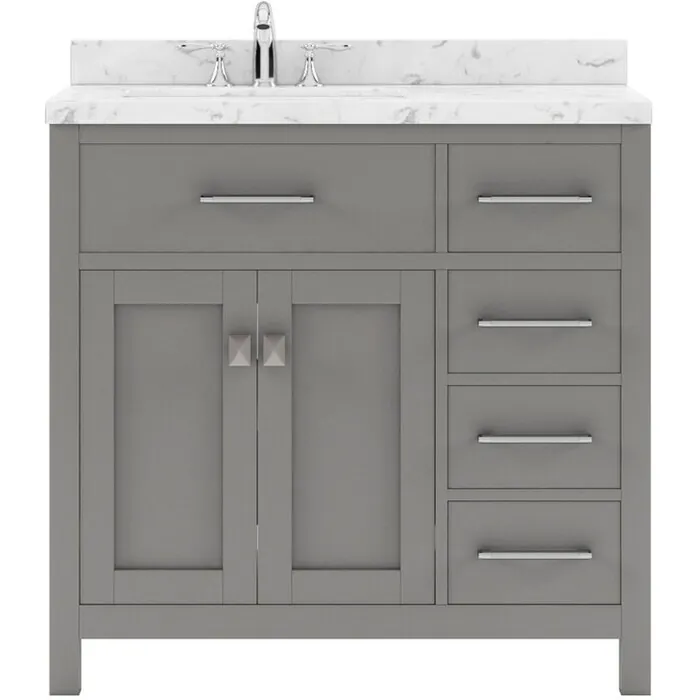 The Caroline Parkway vanity collection emanates an understated elegance that brings beauty and grace to just about any living space. Contemporary shaker style doors and clean lines make it a versatile addition to modern or transitional designs while offering bountiful storage as to not sacrifice functionality. Soft-closing door hinges and drawer glides provide added luxury, safety, and longevity. Each Caroline Parkway vanity is handcrafted with a 2" solid wood birch frame built to last a lifetime.The Caroline Parkway vanity collection emanates an understated elegance that brings beauty and grace to just about any living space.Contemporary shaker style doors and clean lines make it a versatile addition to modern or transitional designs while offering bountiful storage as to not sacrifice functionality.Functional & Versatile - Soft-closing door hinges and drawer glides provide added luxury, safety, and longevity. Each Caroline Parkway vanity is handcrafted with a 2" solid wood birch frame built to last a lifetime.Vanity kit includes quartz countertop in Cultured Marble. Unmatched in resilience, this countertop is non-porous and extremely resistant to impact, stains, and scratches. Conveniently pre-drilled for ease of installation and never requires sealing.Easy Installation - Base cabinet is fully assembled and ready to be installed.Bathroom Vanity Set - This vanity kit includes cabinet, sink, and countertop. Components have been expertly designed and engineered for optimal stylistic fit and compatibility with this particular cabinet.Sized For Fit & Storage - 36 in. W x 22 in. D x 35 in. HIncludes - 36" Gray Cabinet, Cultured Marble Quartz Countertop, 1 Square Undermount SinkAmple Storage - 2 Total Functional Soft-Close Doors and 4 Total Functional Soft-Close Drawers