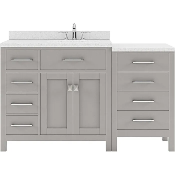 The Caroline Parkway vanity collection emanates an understated elegance that brings beauty and grace to just about any living space. Contemporary shaker style doors and clean lines make it a great addition to modern or transitional designs while offering bountiful storage as to not sacrifice functionality. The modular design is both eye-catching and phenomenally versatile. Soft-closing door hinges and drawer glides provide added luxury, safety, and longevity. Each Caroline Parkway vanity is handcrafted with a 2" solid wood birch frame built to last a lifetime.The Caroline Parkway vanity collection emanates an understated elegance that brings beauty and grace to just about any living space.Contemporary shaker style doors and clean lines make it a great addition to modern or transitional designs while offering bountiful storage as to not sacrifice functionality. The modular design is both eye-catching and phenomenally versatile.Functional & Versatile - Soft-closing door hinges and drawer glides provide added luxury, safety, and longevity. Each Caroline Parkway vanity is handcrafted with a 2" solid wood birch frame built to last a lifetime.Vanity kit includes quartz countertop in Dazzle White. Unmatched in resilience, this countertop is non-porous and extremely resistant to impact, stains, and scratches. Conveniently pre-drilled for ease of installation and never requires sealing.Easy Installation - Base cabinet is fully assembled and ready to be installed.Bathroom Vanity Set - This vanity kit includes cabinet, sink, and countertop. Components have been expertly designed and engineered for optimal stylistic fit and compatibility with this particular cabinet.Sized For Fit & Storage - 57 in. W x 22 in. D x 35 in. HIncludes - 57" Gray Cabinet, Dazzle White Quartz Countertop, 1 Round Undermount SinkAmple Storage - 2 Total Functional Soft-Close Doors and 4 Total Functional Soft-Close Drawers