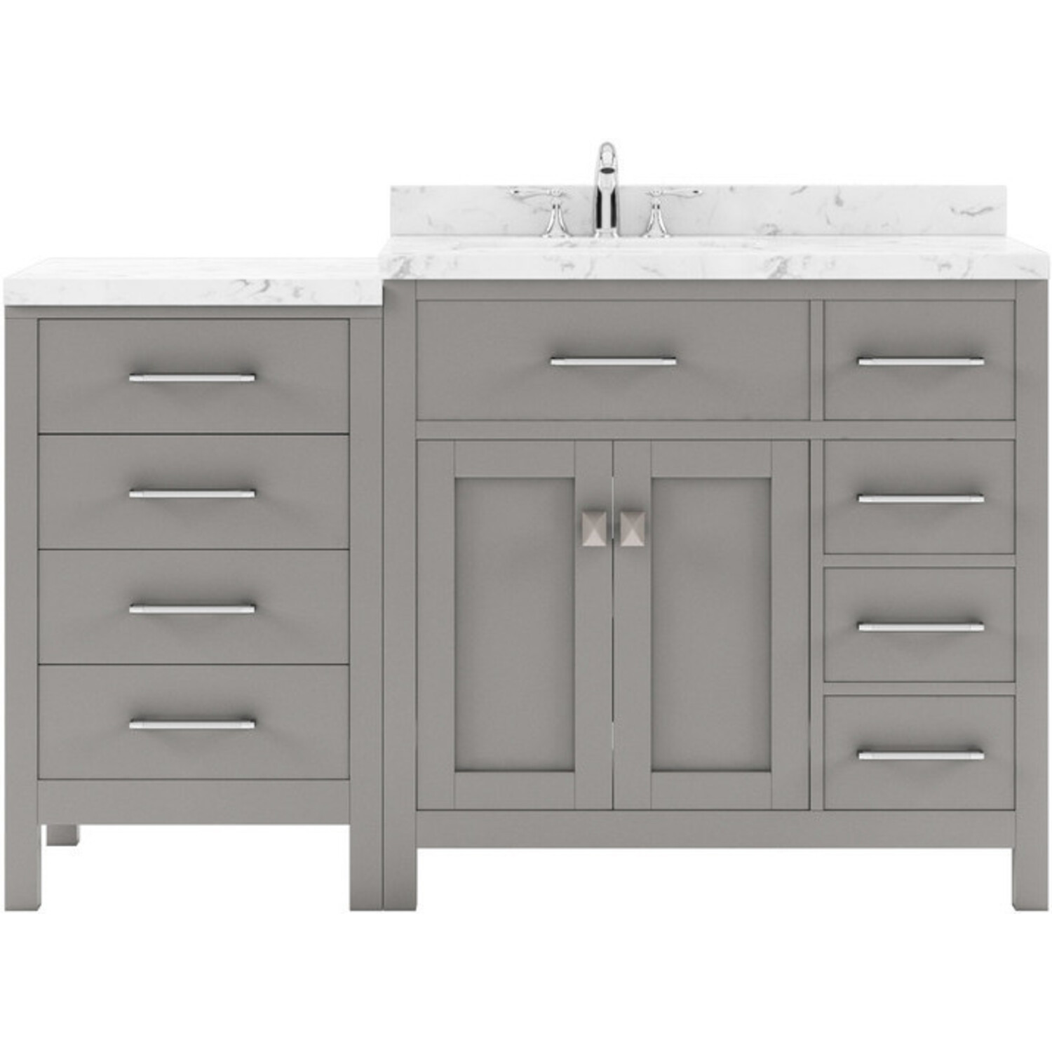 The Caroline Parkway vanity collection emanates an understated elegance that brings beauty and grace to just about any living space. Contemporary shaker style doors and clean lines make it a great addition to modern or transitional designs while offering bountiful storage as to not sacrifice functionality. The modular design is both eye-catching and phenomenally versatile. Soft-closing door hinges and drawer glides provide added luxury, safety, and longevity. Each Caroline Parkway vanity is handcrafted with a 2" solid wood birch frame built to last a lifetime.The Caroline Parkway vanity collection emanates an understated elegance that brings beauty and grace to just about any living space.Contemporary shaker style doors and clean lines make it a great addition to modern or transitional designs while offering bountiful storage as to not sacrifice functionality. The modular design is both eye-catching and phenomenally versatile.Functional & Versatile - Soft-closing door hinges and drawer glides provide added luxury, safety, and longevity. Each Caroline Parkway vanity is handcrafted with a 2" solid wood birch frame built to last a lifetime.Vanity kit includes quartz countertop in Cultured Marble. Unmatched in resilience, this countertop is non-porous and extremely resistant to impact, stains, and scratches. Conveniently pre-drilled for ease of installation and never requires sealing.Easy Installation - Base cabinet is fully assembled and ready to be installed.Bathroom Vanity Set - This vanity kit includes cabinet, sink, and countertop. Components have been expertly designed and engineered for optimal stylistic fit and compatibility with this particular cabinet.Sized For Fit & Storage - 57 in. W x 22 in. D x 35 in. HIncludes - 57" Gray Cabinet, Cultured Marble Quartz Countertop, 1 Square Undermount SinkAmple Storage - 2 Total Functional Soft-Close Doors and 4 Total Functional Soft-Close Drawers