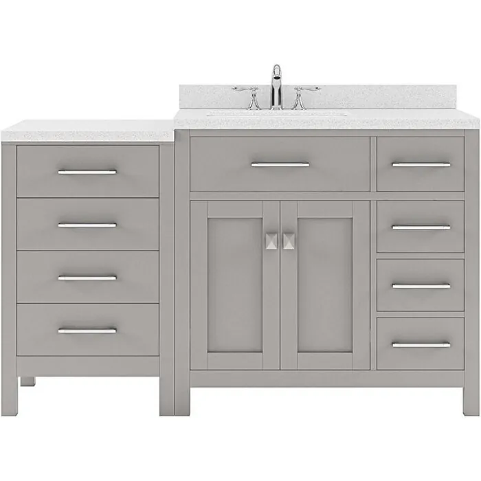 The Caroline Parkway vanity collection emanates an understated elegance that brings beauty and grace to just about any living space. Contemporary shaker style doors and clean lines make it a great addition to modern or transitional designs while offering bountiful storage as to not sacrifice functionality. The modular design is both eye-catching and phenomenally versatile. Soft-closing door hinges and drawer glides provide added luxury, safety, and longevity. Each Caroline Parkway vanity is handcrafted with a 2" solid wood birch frame built to last a lifetime.The Caroline Parkway vanity collection emanates an understated elegance that brings beauty and grace to just about any living space.Contemporary shaker style doors and clean lines make it a great addition to modern or transitional designs while offering bountiful storage as to not sacrifice functionality. The modular design is both eye-catching and phenomenally versatile.Functional & Versatile - Soft-closing door hinges and drawer glides provide added luxury, safety, and longevity. Each Caroline Parkway vanity is handcrafted with a 2" solid wood birch frame built to last a lifetime.Vanity kit includes quartz countertop in Dazzle White. Unmatched in resilience, this countertop is non-porous and extremely resistant to impact, stains, and scratches. Conveniently pre-drilled for ease of installation and never requires sealing.Easy Installation - Base cabinet is fully assembled and ready to be installed.Bathroom Vanity Set - This vanity kit includes cabinet, sink, and countertop. Components have been expertly designed and engineered for optimal stylistic fit and compatibility with this particular cabinet.Sized For Fit & Storage - 57 in. W x 22 in. D x 35 in. HIncludes - 57" Gray Cabinet, Dazzle White Quartz Countertop, 1 Round Undermount SinkAmple Storage - 2 Total Functional Soft-Close Doors and 4 Total Functional Soft-Close Drawers