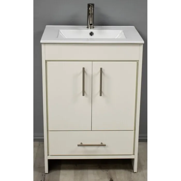 Pacific 24 inch Modern Bathroom Vanity in White with Integrated Ceramic Top and Stainless Steel Round Hollow Hardware MTD-3124W-14 Made in USA