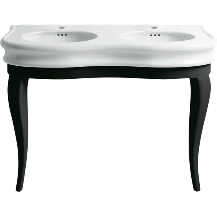 Whitehaus Collection displays high levels of sophistication and serenity with the Isabella Collection. Crafted from the highest quality vitreous china available, these basins are as durable as they are luxurious. The Isabella Collection is offered in a variety of shapes and sizes. The smooth, seamless design creates a modern, contemporary focal point, making it the perfect choice for any décor. Complement any decor with this large double basin bathroom console. Complete with single faucet hole drill for each bowl, seamless rounded rim on all sides, black leg supports and overflow, this console represents the very best in quality and durability.