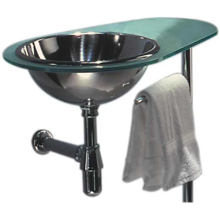 New Generation AQUA – laminated matte glass counter top with polished stainless steel drop-in basin on right side – polished chrome wall mount supports and towel bar post included