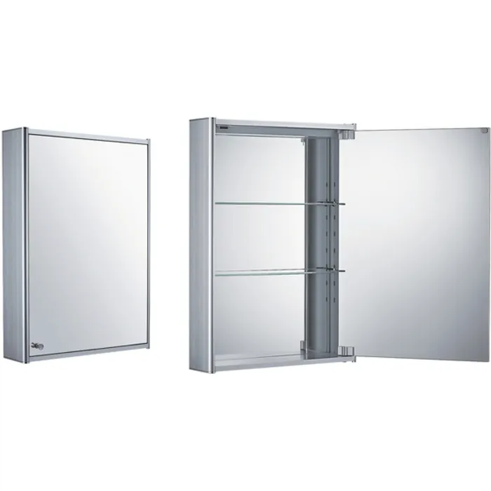Single two sided mirrored door medicine cabinet with two adjustable glass shelves and mirror faced back wall.