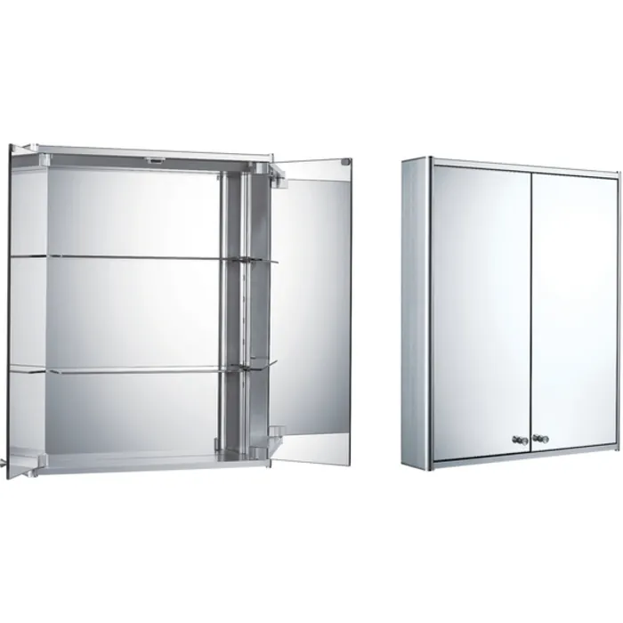 Double two sided mirrored door medicine cabinet with two adjustable glass shelves and mirror faced back wall.