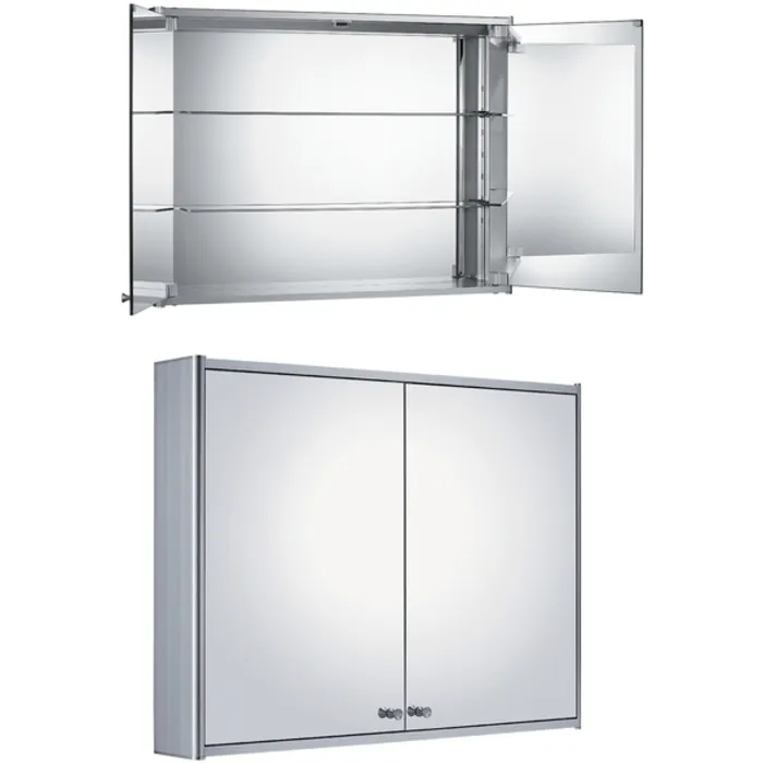 Double two sided mirrored door medicine cabinet with two adjustable glass shelves and mirror faced back wall.