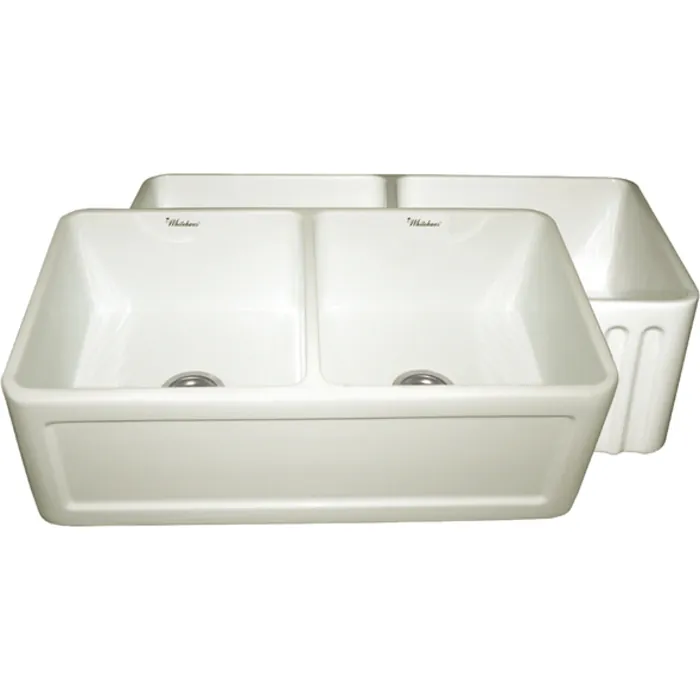Whitehaus Farmhaus Fireclay Reversible Double Bowl Sink With A Concave Front Apron On One Side And Fluted Front Apron On The Other In Biscuit WHFLCON3318-BISCUIT