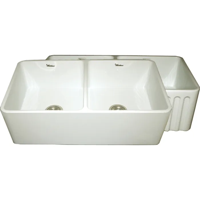 Whitehaus Collection offers the widest selection of fireclay sinks on the market today. Every sink is handmade from natural clay, molded, and then baked into an elegant, smooth and glossy finish. Being eco-friendly and lead free only adds to the allure of Farmhaus Fireclay sink. Proven to be durable and resistant to extreme temperatures fireclay sinks are visually appealing and timeless in design. Whitehaus Collection’s patented, eco-friendly, Farmhaus Fireclay sinks are available in a variety of colors and designs and will complete the look in any kitchen. The Whitehaus Collection 33" Reversible series double bowl fireclay sink with smooth front apron on one side and fluted front apron on the opposite side is featured here in your choice of White, Biscuit, Black and Sapphire Blue.