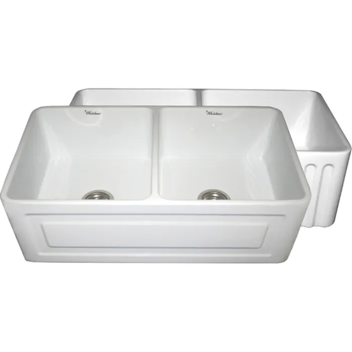 Whitehaus Collection offers the widest selection of fireclay sinks on the market today. Every sink is handmade from natural clay, molded, and then baked into an elegant, smooth and glossy finish. Being eco-friendly and lead free only adds to the allure of Farmhaus Fireclay sink. Proven to be durable and resistant to extreme temperatures fireclay sinks are visually appealing and timeless in design. Whitehaus Collection’s patented, eco-friendly, Farmhaus Fireclay sinks are available in a variety of colors and designs and will complete the look in any kitchen. The Whitehaus Collection 33" Reversible Double Bowl fireclay sink with a raised front panel apron on one side and a fluted front apron on the opposite side featured here in your choice of White, Biscuit, Black and Sapphire Blue.