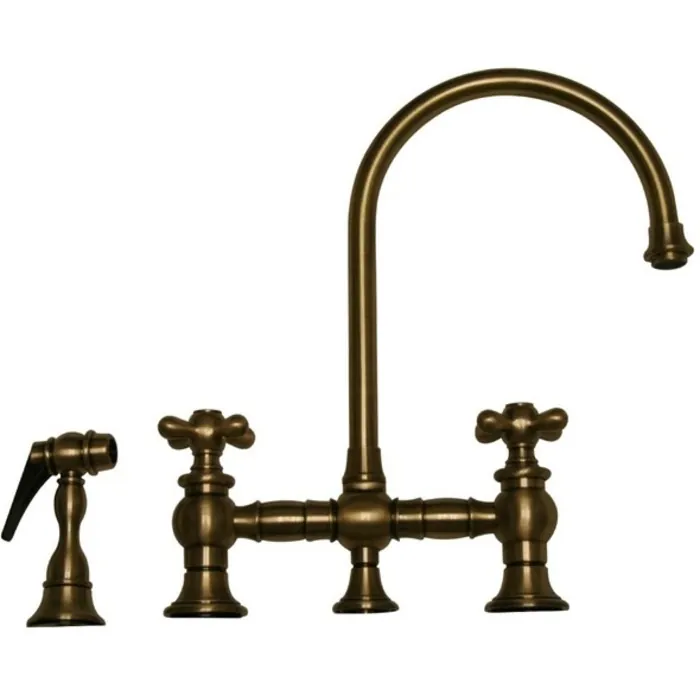 Whitehaus Vintage Iii Bridge Faucet With Long Gooseneck Swivel Spout, Cross Handles And Solid Brass Side Spray In Antique Brass WHKBCR3-9101-AB