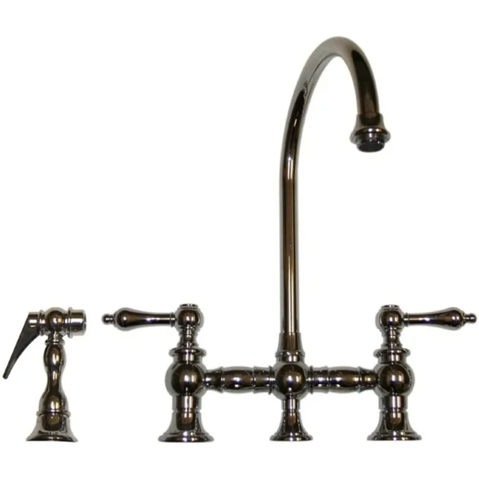 Whitehaus Collection's Vintage III kitchen bridge faucets complement many kitchens styles. Ensuring strength and durability for a lifetime these faucets are made from solid brass and will become a piece in your home to withstand the test of time. This faucet features a long gooseneck swivel spout, lever handles and solid brass side spray is available in Polished Chrome, Brushed Nickel, Antique Brass, Antique Copper, Oil Rubbed Bronze and Pewter.