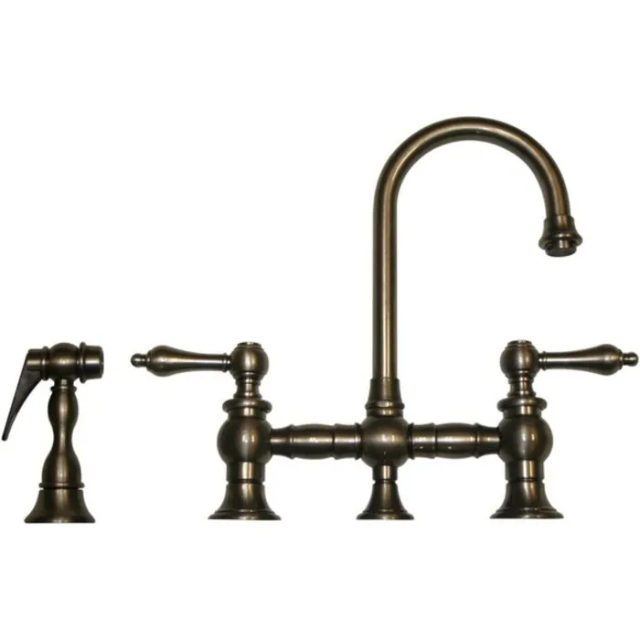 Whitehaus Collection's Vintage III entertainment/prep bridge faucets complement many kitchens styles. Ensuring strength and durability for a lifetime these faucets are made from solid brass and will become a piece in your home to withstand the test of time. This faucet features a short gooseneck swivel spout, lever handles and solid brass side spray is available in Polished Chrome, Brushed Nickel, Antique Brass, Antique Copper, Oil Rubbed Bronze and Pewter.