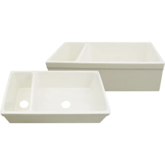 Whitehaus Farmhaus Fireclay Quatro Alcove Large Reversible Sink And Small Bowl With Decorative 2 ½ inch Lip On Both Sides In Biscuit WHQDB542-BISCUIT