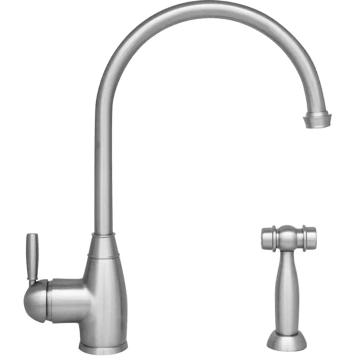 Queenhaus single lever faucet with a long gooseneck spout, solid single lever handle and solid side spray
