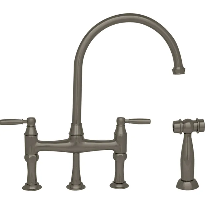Queenhaus bridge faucet with a long gooseneck spout, solid lever handles and solid side spray