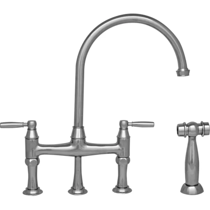 Queenhaus bridge faucet with a long gooseneck spout, solid lever handles and solid side spray