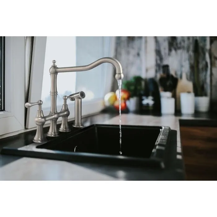 Whitehaus Collection's Waterhaus faucets offer clean and innovative designs that are guaranteed to impress. Designed with the environment in mind, these faucets are lead free and constructed from scratch resistant commercial grade stainless steel. Functional for many layouts, the Waterhaus lever handle bridge faucet with traditional swivel spout and solid side spray represents the best of its kind.
