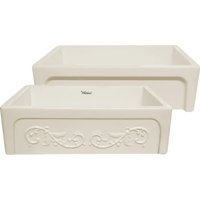 Whitehaus Glencove St. Ives 33 inch Front Apron Fireclay Sink With An Intricate Vine Design On One Side And An Elegant Beveled Front Apron On The Opposite Side In Biscuit WHSIV3333-BISCUIT