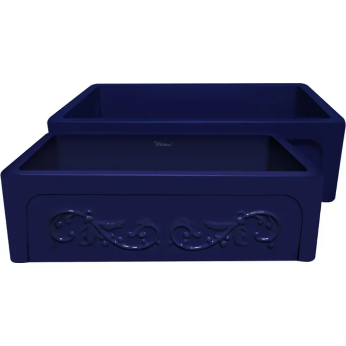 Whitehaus Glencove St. Ives 33 inch Front Apron Fireclay Sink With An Intricate Vine Design On One Side And An Elegant Beveled Front Apron On The Opposite Side In Sapphire Blue WHSIV3333-BLUE