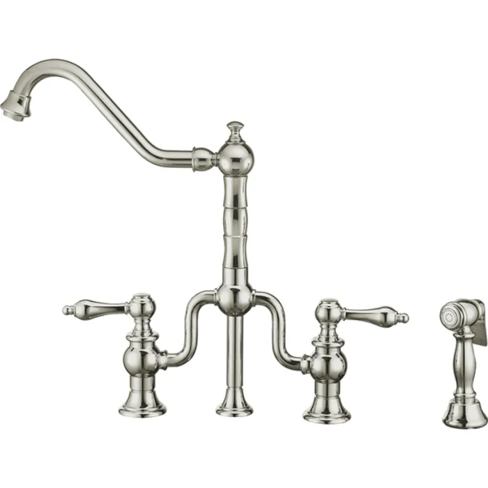 Whitehaus Collection’s Twisthaus Plus Kitchen Faucets will awaken your senses with their unique traditional design. Worthy of being placed in any home, these bridge faucets are made of solid brass ensuring you quality and durability for years to come. The bridge style kitchen faucet is known best for their simple, clean lines and open spaces. This playful, yet distinctive style has a long traditional swivel spout, solid lever handles and solid brass side spray. Available in your choice of: Polished Chrome, Brushed Nickel, Antique Brass, Oil Rubbed Bronze and Polished Nickel it will make an impression on your kitchen design.